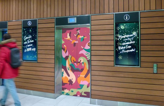 Пример брендирования дверей кабины лифта самоклеящейся пленкой представлен на фото: